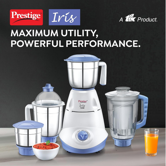 Prestige Iris 750 Watt Mixer Grinder with 3 Stainless Steel Jar + 1 Juicer Jar (White and Blue)Prestige Iris 750 Watt Mixer Grinder with 3 Stainless Steel Jar + 1 Juicer Jar (White and Blue)